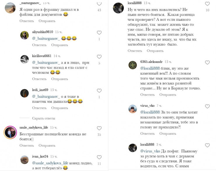 Мнения пользователей соцсетей, посмотревших ролик, разделились. Одни утверждали, что неважен метод, главное – выявить и остановить на дороге пьяного водителя, другие задавались вопросом: куда делось современное оборудование, выявляющее запах алкоголя?