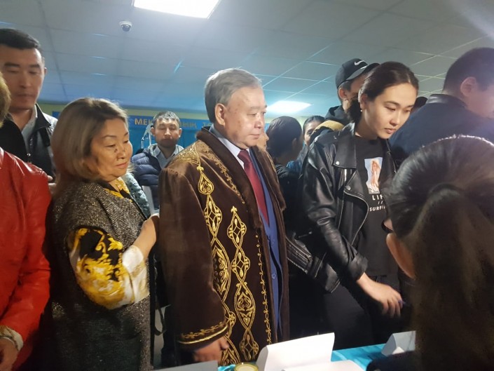 Примерно в 9 утра на избирательный участок пришел кандидат от Федерации профсоюзов Казахстана Амангельды Таспихов. На выборы он пришел вместе с супругой.