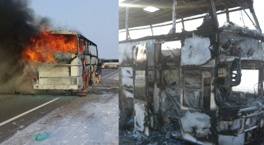 Фото и видеокадры с места ДТП в Актюбинской области. Страшная авария произошла 18 января в Иргизском районе на трассе Самара - Шымкент. Автобус с 55 пассажирами и двумя водителям загорелся на ходу. Пятерым удалось выбраться из полыхающего транспорта. 52 гражданина Узбекистана погибли на месте. Самому молодому из них было 19 лет. Автобус ехал из поселка Жибек Жолы Сарыагашского района Южно-Казахстанской области до Казани.