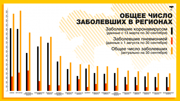 Ежедневная информация о новых зараженных из регионов поступает не в полной мере: нет данных о заболевших коронавирусной пневмонией. Общие цифры объединяют и публикуют раз в несколько дней. Поэтому на сегодня в Министерстве здравоохранения смогли предоставить лишь данные на 30 сентября. Но они также помогут оценить ситуацию с пандемией коронавируса в разных областях Казахстана.
