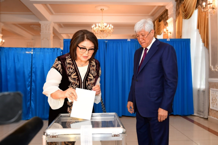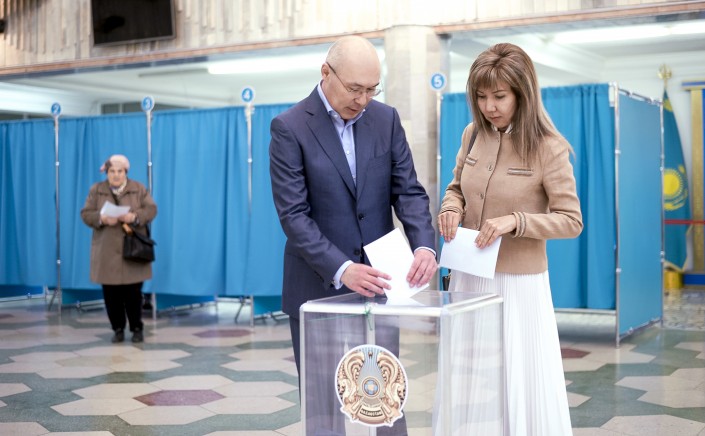 Аким Алматинской области Амандык Баталов вместе с супругой проголосовал на избирательном участке в здании Дворца культуры имени Ильяса Жансугурова.