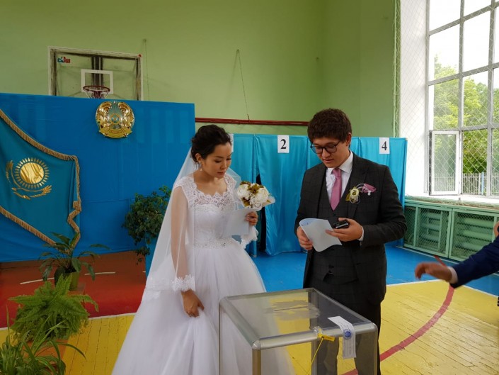 В Усть-Каменогорске на выборы пришли молодожены. Жених Эльдар Майданбеков сделал предложение девушке полгода назад. Датой регистрации молодые люди выбрали 9 июня, еще не подозревая, что именно в этот день в стране состоятся выборы президента.