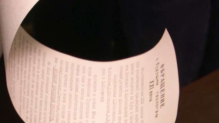 "Обращаемся к будущему поколению геологов! Мы были пионерами освоения природных богатств степи Северного Казахстана. Начинали работы в неосвоенных местах, в тяжелые годы после Второй, и мы надеемся последней человечества, мировой войны. Не было геологических карт, жилья, не хватало оборудования, снаряжения. Нам помогали романтика, вера в лучшее будущее", - зачитал послание геолог Талгат Исасеитов.