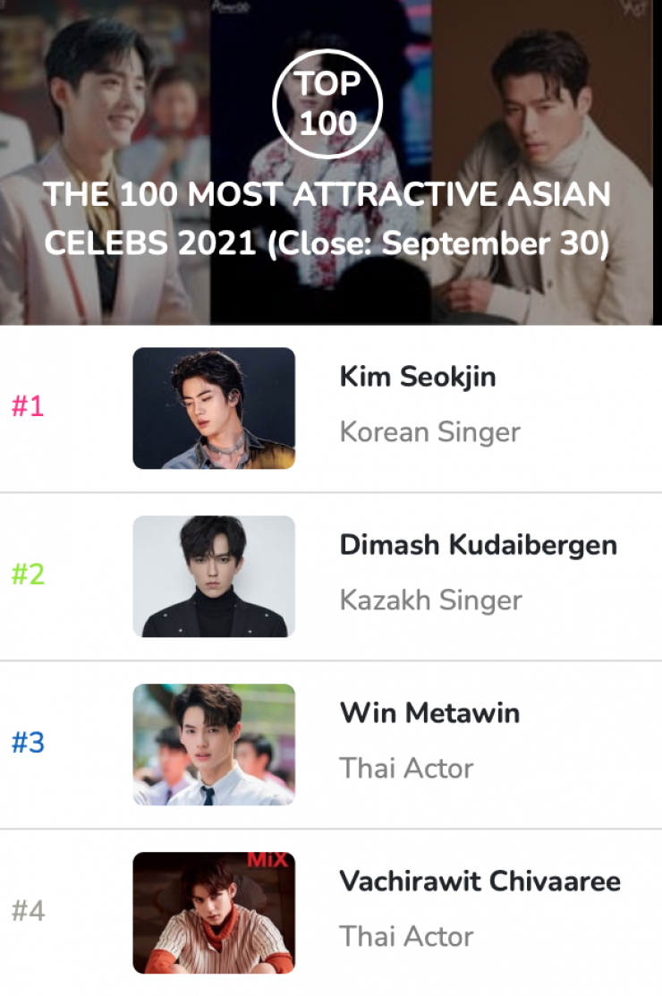 Конкурс самых красивых азиатских людей продлится до 30 сентября. Димаш Кудайберген расположился на втором месте (1 290 408 голосов), уступая только солистку южно-корейской группы BTS Ким Сокджину с 1 973 428 голосами. На третьем месте пока находится тайский актер Уин Метавин с 967 161 голосом.