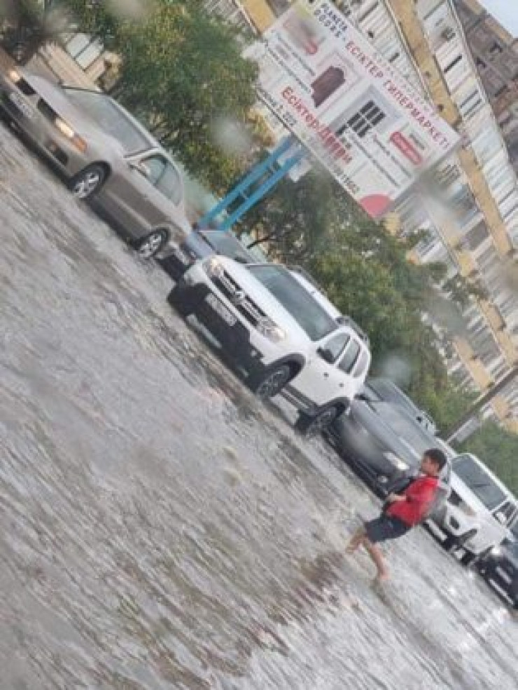Инцидент произошел 28 июля на дороге между 12-м и 16-м микрорайонами, напротив ТРК "Актау". Как пояснила автор снимков, ребенок потерял обувь, когда переходил улицу. Дорогу по щиколотку затопило после дождя.