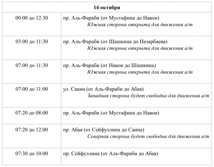 Таблица по перекрытию дорог на Алматинский полумарафон - 2018 (14 октября 2018 года)