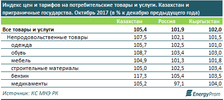 По итогам октября уровень инфляции в РК составил к началу года 5,4 процента. Для сравнения, в соседней по ЕАЭС России удорожание товаров и услуг в декабре 2016 года составило всего 1,9 процента, в Кыргызстане - 2 процента.