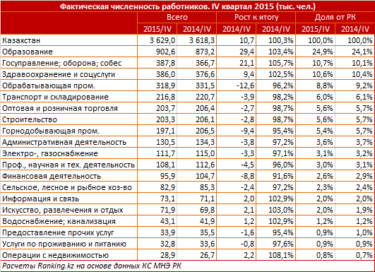 Как сообщает аналитический портал, в четвертом квартале 2015 года фактическая численность работников в Казахстане составила 3,629 миллиона человек. Отметим, что за год количество работающих увеличилось на 0,3 процента. За последние два года прирост наемных работников составил два процента.