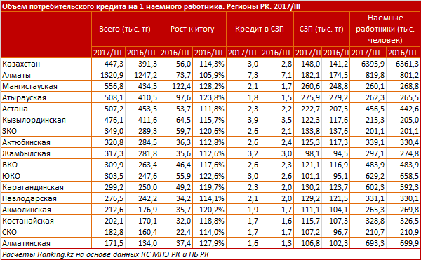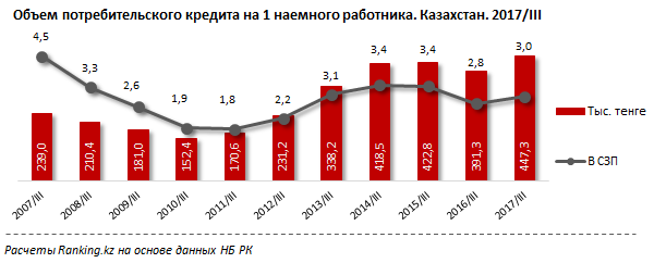 Уровень потребительской закредитованности за год к концу третьего квартала 2017 года вырос на 14,3 процента и составил 447,3 тысячи тенге на одного наемного работника. Объем потребительской задолженности одного наемного работника перед банком составил 3 среднемесячные заработные платы (СЗП).