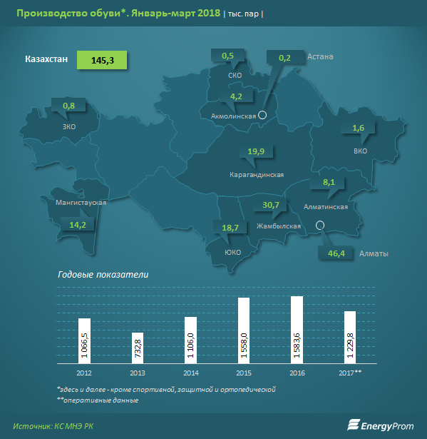 Почти треть производства приходится на Алматы - 46,4 тысячи пар обуви, сразу на 45,3 процента меньше, чем в прошлом году.