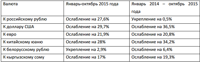 Отмечается, что за 10 месяцев 2015 года ослабление тенге к рублю составило 27,6 процента. При этом, с начала 2014 года по октябрь 2015 года тенге практически достиг паритета к рублю и даже немного укрепился. Напомним, в 2014 году наблюдалось значительное ослабление российской валюты. Также Нацбанк привел таблицу с примерами ослабления или укрепления тенге к ряду других валют.