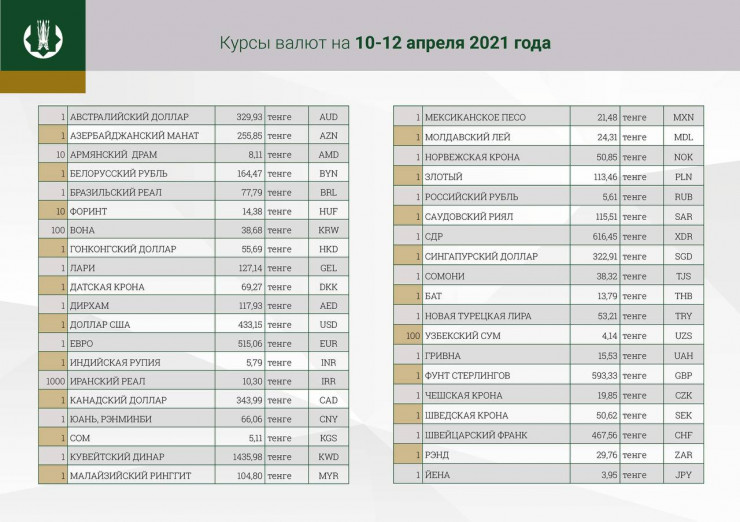 Национальный банк Казахстана назвал официальный курс доллара на 10-12 апреля, передает Tengrinews.kz.