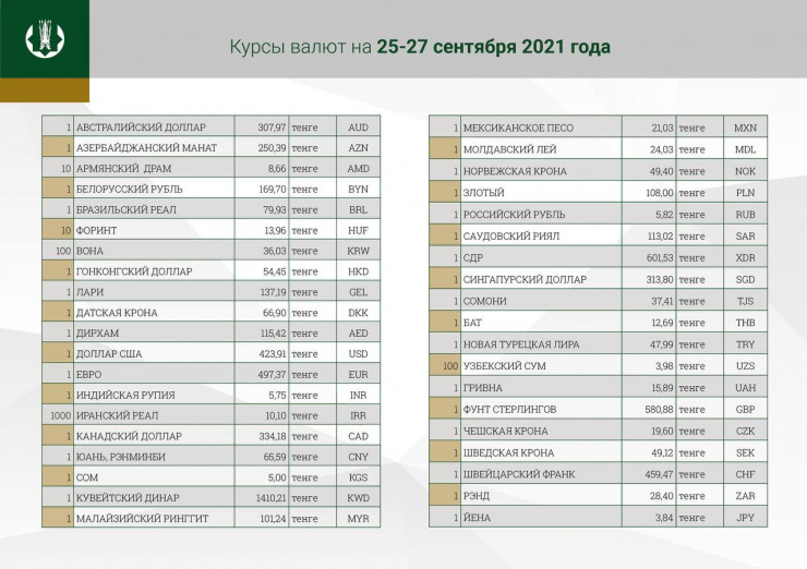 В выходные дни и понедельник курс доллара будет равен 423,91 тенге. Отметим, что официальный курс американской валюты на 24 сентября составляет 425,02 тенге.