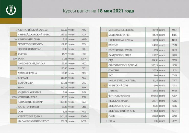 Национальный банк Казахстана установил официальный курс доллара к тенге на 18 мая, передает Tengrinews.kz.