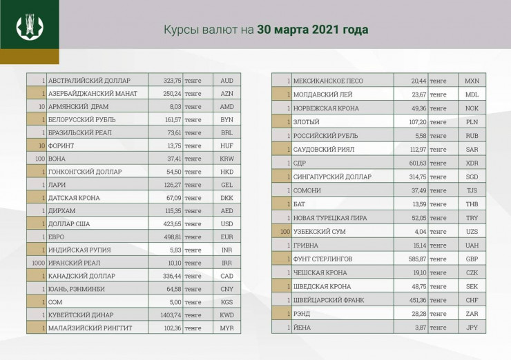 Национальный банк Казахстана назвал официальный курс доллара на 30 марта, передает Tengrinews.kz.