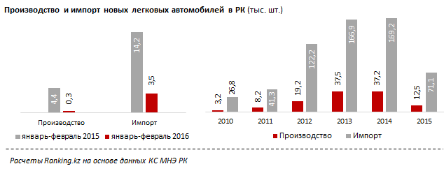 "Если в январе-феврале 2015 года отечественные предприятия выпустили 4373 машины, то за аналогичный период текущего года - только 327 - меньше в 13 раз. Причем все эти автомобили сошли с конвейеров в январе. Февральские объемы производства, по данным Комитета по статистике, были равны нулю. Упал также и импорт - с прошлогодних 14,2 тысячи до 3,5 тысячи автомобилей - в 4 раза. Из них 2,6 тысячи были завезены в январе и только 0,9 тысячи в феврале", - отмечают аналитики.
