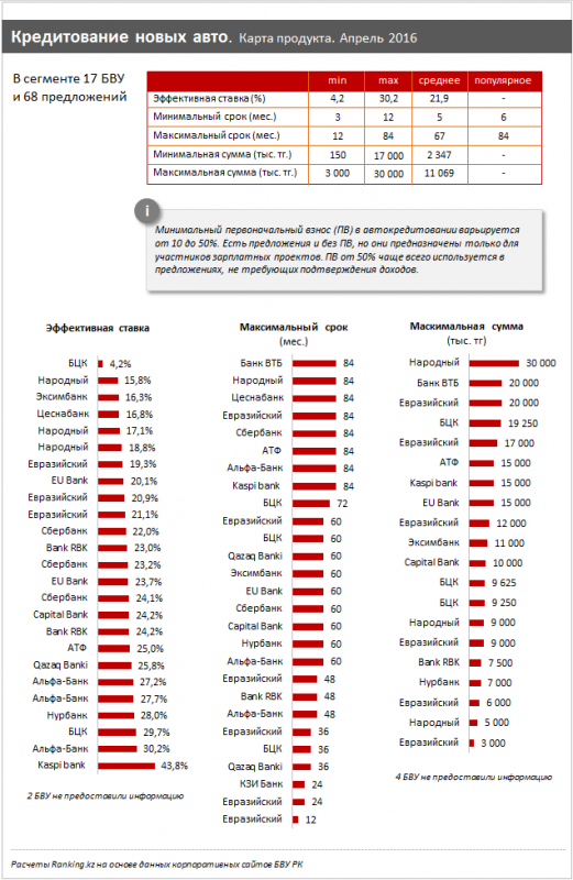 Тем не менее, автокредитование остается одной из наиболее широко представленных банковских услуг. В этом сегменте рынка работают 17 БВУ, которые предлагают 68 кредитных продуктов с различными условиями для приобретения нового авто. Максимальный срок автокредита может достигать 84 месяцев. Самые длинные займы предлагают Kaspi, "Альфа", "Народный Банк", "ВТБ", "Евразийский", "Цесна", "Сбербанк" и "АТФ".
