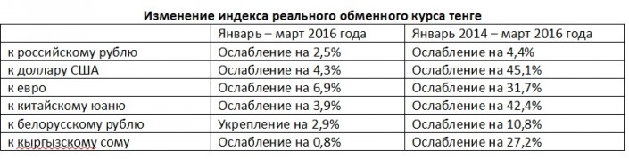 "За первый квартал 2016 года тенге в реальном выражении ослаб на 2,8 процента (изменение индекса реального эффективного обменного курса к валютам 34 стран), а с начала 2014 года по март 2016 года ослабление составило 27,6 процента", - говорится в распространенном сообщении.