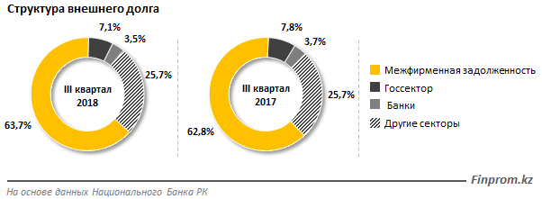 По состоянию на конец III квартала 2018 года в структуре внешнего долга наибольшую долю занимала межфирменная задолженность: 63,7 процента, или 102,8 миллиарда долларов, на 0,9 процента больше, чем годом ранее.