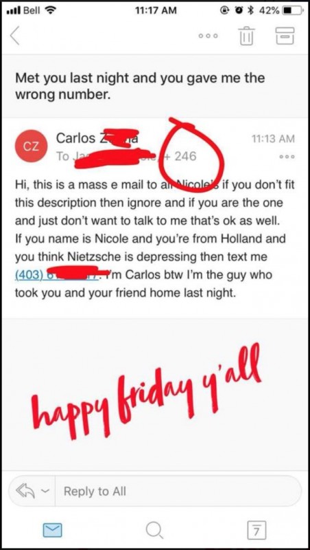 Студент канадского университета Калгари Карлос Зетина познакомился в баре с девушкой по имени Николь. К сожалению, выяснилось, что номер телефона, который она дала, неправильный. Но молодой человек, что называется, влюбился с первого взгляда и не хотел, чтобы девушка подумала, будто он "плохой парень, который ей не написал". Он разослал письма 247 представительницам прекрасной половины с разными вариациями имени Николь из каталога канадского университета. Среди них были и первокурсницы, и профессора.