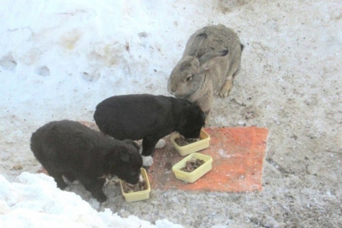 В норке они жили около полутора месяцев, в 40-градусные морозы он согревал малышей своим теплом. Необычную семейку заметила жительница Азово, которая стала их подкармливать. Вскоре приехали волонтеры. Щенки выбежали из норки, кролик же засуетился, испугавшись чужаков, он попытался их загнать обратно.
