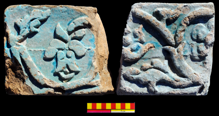 Пол вымощен маленькими каменными плитками и камнями. Расчистка пока не позволила представить внутреннее убранство храма. Внутри были обнаружены фрагменты обожженных кирпичей и плиток, украшенных налепным растительным орнаментом, а также железные и бронзовые гвозди. Интересна находка деревянной палочки для письма - калама.