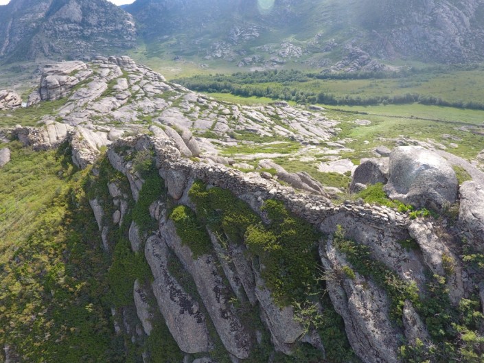 Вскрытие дернового слоя не выявило остатков лестницы, вероятно, она была еще раньше разобрана на строительные материалы. Вся платформа была укреплена мощной каменной стеной шириной около 2 метров, предохраняющей платформу от расползания.