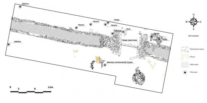 "Этот человеческий скелет без черепа был расчищен под каменными завалами. Видимо, был потревожен при разборе стены в XIX-XX веках и перезахоронен на стороне. Из-за почти полного отсутствия погребального материала точно сказать, к какому периоду относится скелет, не представляется возможным. В данный момент кости обрабатываются антропологами", - поделился Денис Сорокин.