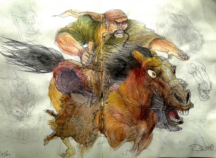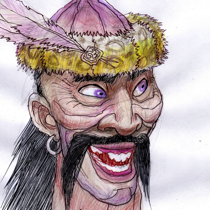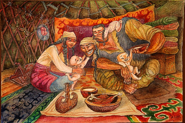 Джумгалбек Бейшебаев - художник-декоратор в бишкекском ТЮЗе. Но в арт-пространстве он известен как Джум Гунн, художник, имеющий свой особый взгляд на центральноазиатскую культуру. Этнические герои его картин очень похожи на персонажей диснеевских мультиков. И это не случайность: было время, когда Джум Гунн сотрудничал с одним из лучших российских аниматоров Александром Дороговым, который 17 лет проработал в студии Уолта Диснея. И именно у него кыргызский художник частично перенял способ разработки персонажей.