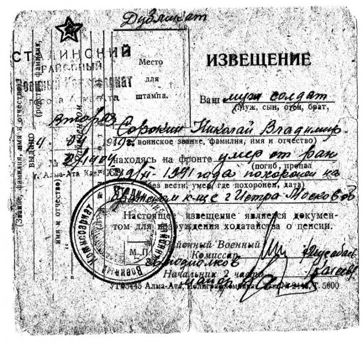 "Моя бабушка Валентина Сорокина рассказывала мне, что он погиб при обороне Москвы. Когда я переехала жить в Москву, я долгое время хотела найти его могилу. Родственники сказали, что у них на хранении есть копия документов, свидетельствующих о том, что он был в 316-й стрелковой дивизии. Была также копия повторного извещения о том, что он умер от ран и похоронен на братском кладбище в городе Истре. Призывался он из Алма-Аты как раз в то время, когда формировалась Панфиловская дивизия.