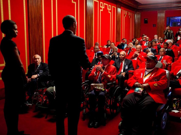 На этом снимке Обама выступает перед показом фильма "Красные хвосты" о летчиках "Таскиги" в 42-местном театре Белого дома.