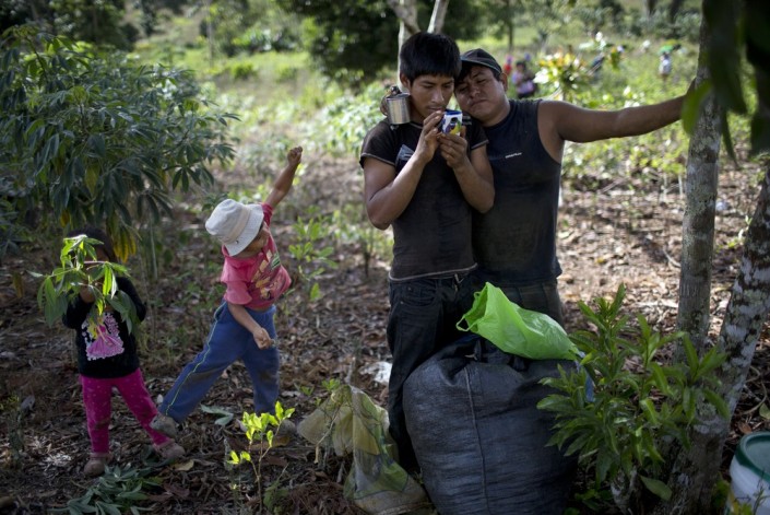 Двое работяг смотрят видео на телефоне во время перерыва. Правительство президента Ольянты Умалы планировало в прошлом году начать уничтожение коки в этом районе, который находится под контролем военных, однако военные сообщили, что уничтожение плантаций коки может укрепить позиции коммунистической партии "Сияющий путь".