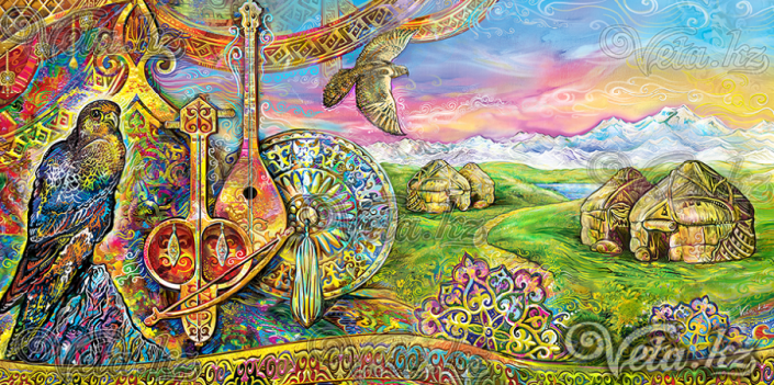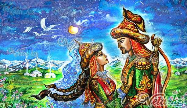 Именно поэтому Вета использовала такие яркие краски. Конкретных персонажей в коллекции нет. К примеру, при создании картины "Қыз Жібек пен Төлеген" у художницы была цель изобразить просто влюбленных - парня и девушку в казахских нарядах, а также показать чувства между ними. Изначально художница хотела нарисовать красивые, сказочные композиции, связанные с казахским эпосом, но безо всякой привязки к героям.