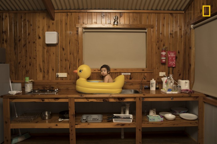 "Во время семейного отдыха мы ехали из Сиднея в Улуру и остановились в придорожном мотеле в небольшом провинциальном городке Нинган, на окраине австралийской глубинки. Было необычайно жарко для этого времени года и очень пыльно. Наша дочь освежается в ванной из резинового утенка".