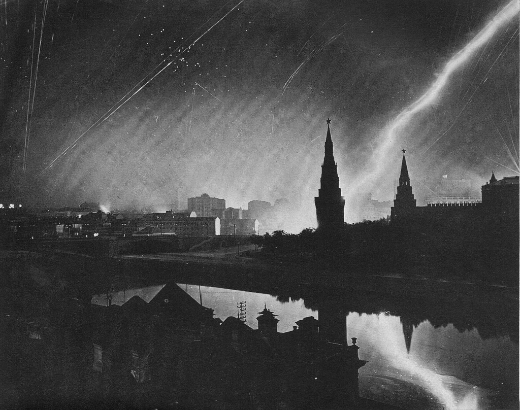 Белые ночи Москвы - это фраза, которую москвичи использовали столетиями, но именно во время войны она обрела смысл. Окна и силуэты домов на фото слева не настоящие. Они нарисованы при помощи негорючей краски на полотне, которым обтянуты здания Кремля. Это часть многоцветной системы камуфляжа Кремля. На стенах также нарисованы несуществующие здания и деревья, а маскировочной сеткой накрыты Царь-пушка и Царь-колокол. Фото сделано с 12-минутной выдержкой.