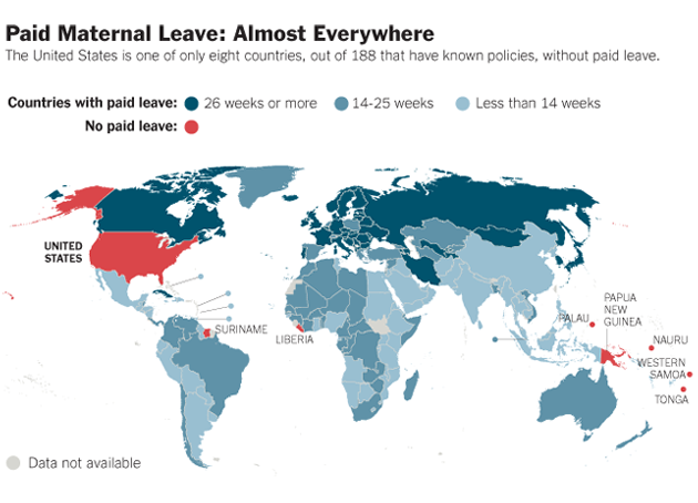 Эта карта основана на данных, собранных социологом из США Джоди Хейманн. Она показывает, в каких странах матерям предоставляется оплачиваемый декретный отпуск и сколько он длится. США попали в восьмерку государств, недружелюбных к молодым матерям: отпуск по уходу за ребенком там не оплачивается вовсе. В том же списке Палау, Науру, Папуа - Новая Гвинея, Самоа, Тонга, Либерия и Суринам.