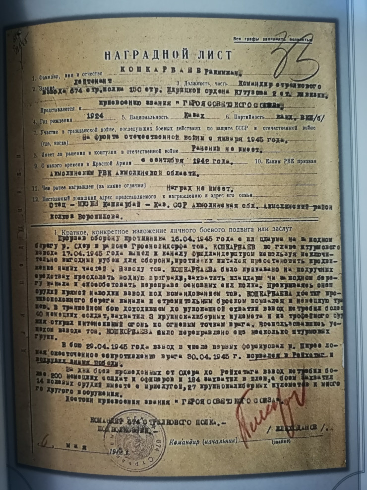Вот краткая выписка из наградного листа Рахимжана Кошкарбаева, который всего через две недели станет знаменосцем Победы.