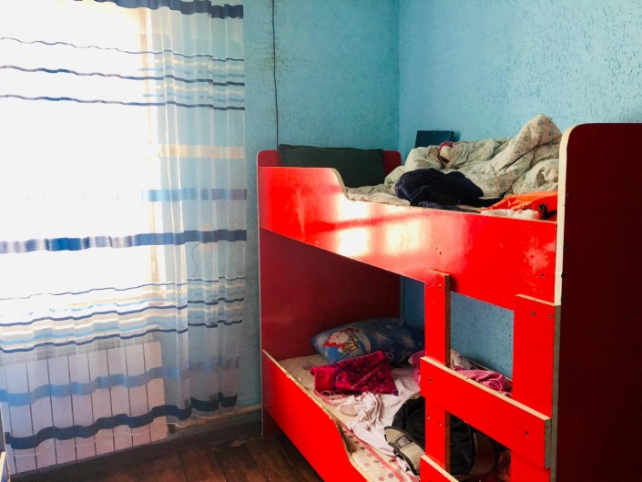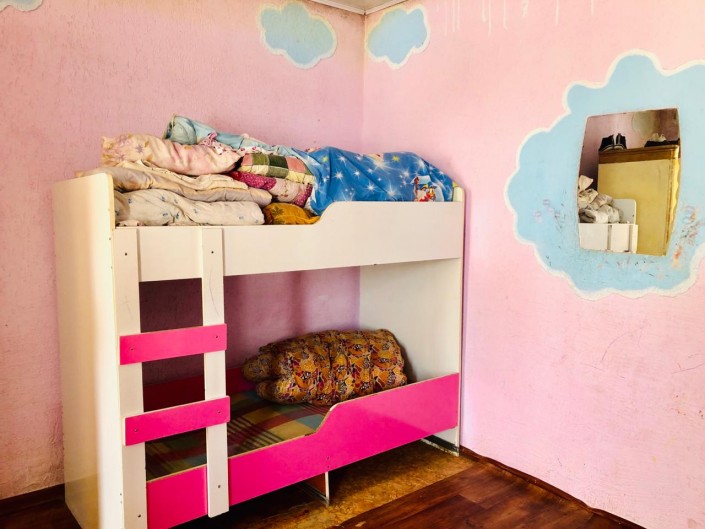 Видно, родители и дети ухаживают за жильем. В доме три комнаты, две из них детские, разделенные на девчачью и мальчиковую зоны. У девочек, как и полагается, розовая спальня, а у мальчиков синяя.