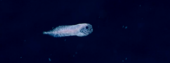 А это - костистая рыба, представитель семейства ошибневых (Ophidiidae), привлеченная огнями подводного аппарата. Снимок сделан на глубине 1840 метров.