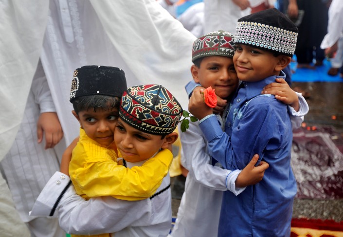 Дети приветствуют друг друга после молитвы, которая знаменует собой окончание священного месяца Рамазан. Мумбаи, Индия.
