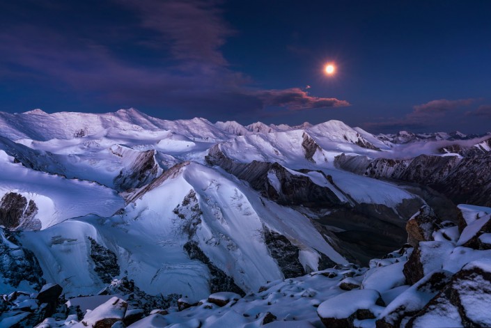 Закат луны на вершине пика Астана (4555 м), ущелье Баянкол, Центральный Тянь-Шань. Август 2017 год. © Ольга Кулакова.