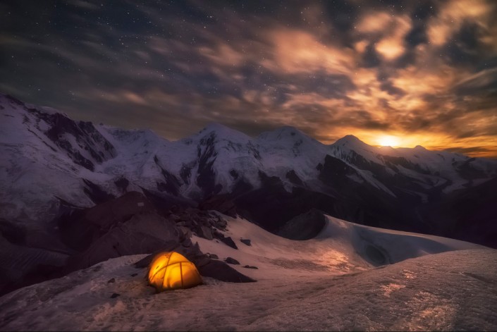 Ночь на гляциологической станции Т-1. Цирк ледника Туюк-Су, Малое Алматинское ущелье, Заилийский Алатау. Январь, 2019 год. © Ольга Кулакова.
