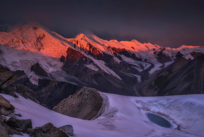 К примеру, запечатлеть вид на хребет Терскей Алатау в предрассветных сумерках стоило особых усилий. Кадр снят с пика Мукагали, высота которого 4433 метра. Это был конец лета, погода в миг испортилась и еще до восхождения было понятно, что ничего хорошего снять не получится и смысла ночевать на горе нет.