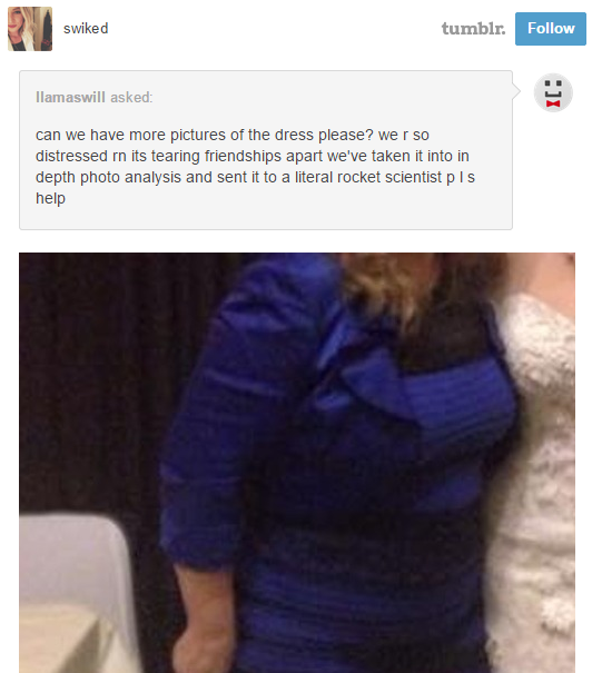 25 февраля пользовательница Tumblr под никнеймом Swiked опубликовала в блоге фотографию платья с вопросом, какого оно цвета: белого с золотым или синего с черным. По словам девушки, она поспорила об этом со своими друзьями.