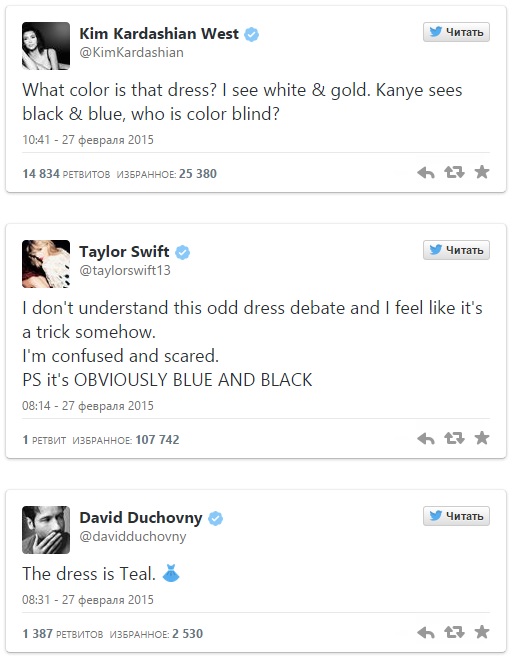 В обсуждениях приняли участие и знаменитости. Например, звезда телевидения и Интернета Ким Кардашьян рассказала подписчикам, что тоже поспорила с мужем по поводу цвета, а певица Тейлор Свифт заявила, что находится в замешательстве по поводу этого вопроса, поскольку "очевидно, что платье синего и черного цветов". Звезда "Секретных материалов" Дэвид Духовны высказал мнение, что платье зеленовато-голубое.
