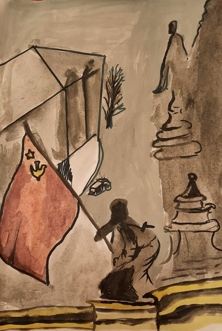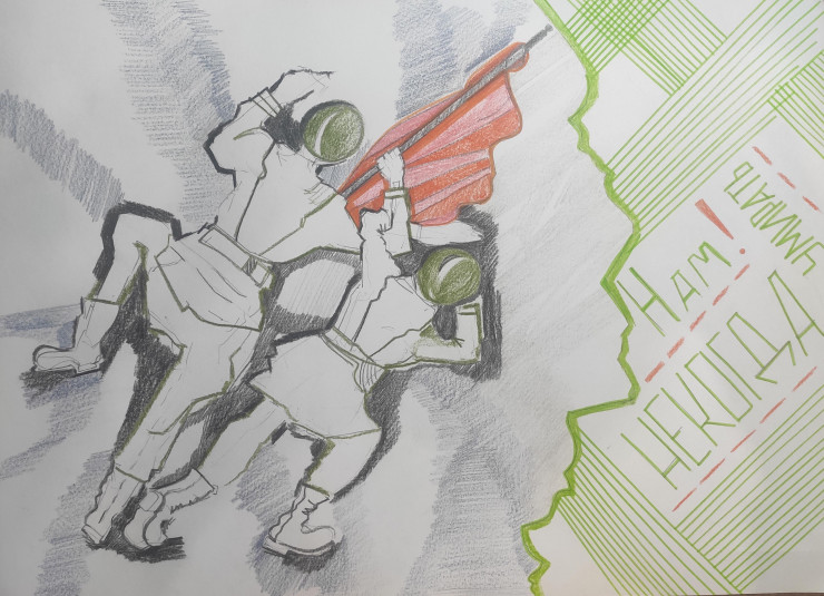 Ею стало историческое событие, произошедшее с участием соотечественника Рахимжана Кошкарбаева. 30 апреля 1945 года он вместе с красноармейцем Григорием Булатовым при штурме столицы гитлеровской Германии, стал первым, кто водрузил красное знамя на Рейхстаге. Чувства гордости и ответственности за память наших предков переполняли меня. Трудности достижения этого подвига я решила показать в своей картине. Она графична и имеет только черный и белый цвет, этот выбор техники не случаен. Я хотела подчеркнуть все действо через черно-белую призму, чтобы зритель окунулся в прошлое и увидел, что даже при таких тонах можно прочувствовать атмосферу того времени и гордость за сыновей нашей родной земли".