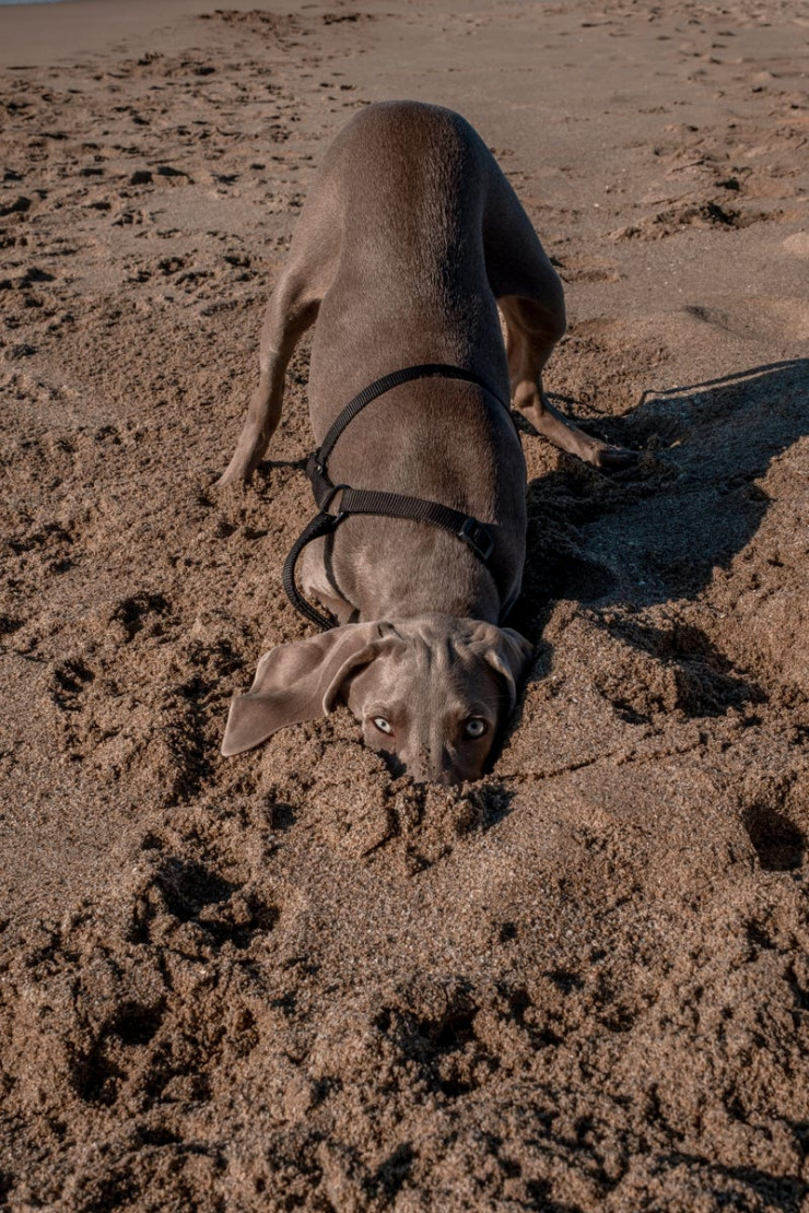 Собака по кличке Нука и ее попытка поиграть в прятки на пляже.