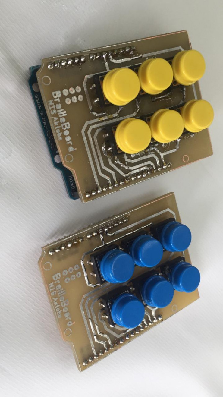 "Наше устройство состоит из шести кнопок, точно так же, как и шесть точек, используемых для построения символов, букв в шрифте Брайля. При разных комбинациях нажатия на эти шесть кнопок можно вводить буквы или символы на компьютере. Мы самостоятельно создавали необходимые платы: рисовали схемы, травили платы (очищали, подготавливали - Прим. Автора), после детализировали, припаивали нужные элементы. Так получили наш нынешний проект. В будущем мы планируем получить патент, поскольку он является действительно уникальным в своем роде", - пояснила Жаннур Айип.