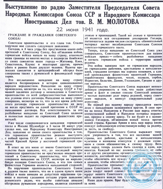В 12 часов дня нарком иностранных дел СССР Вячеслав Молотов выступил по радио с речью, в которой сообщил о нападении Германии и начале войны. Чуть позже его речь зачитал диктор Левитан. Так для советских граждан началась Великая Отечественная война.