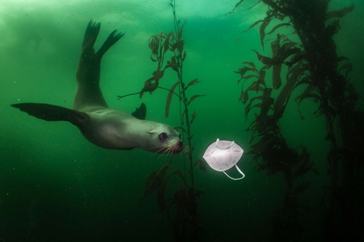Ральф выиграл конкурс в номинации "Человек/природа" со снимком тюленя, который с любопытством приближается к медицинской маске для лица, плавающей в калифорнийских водах недалеко от Монтерея. Пейс сделал этот снимок в ноябре 2020 года, когда впервые увидел маску под водой.